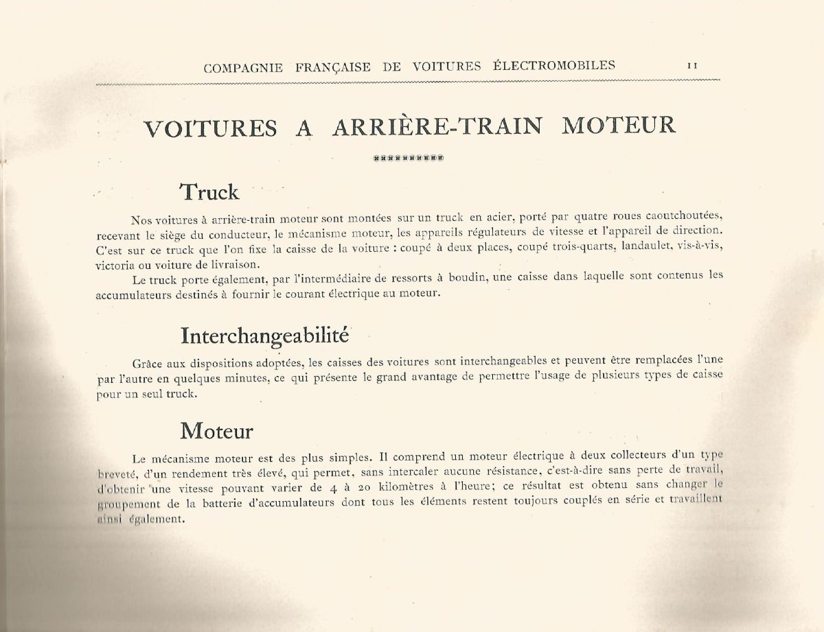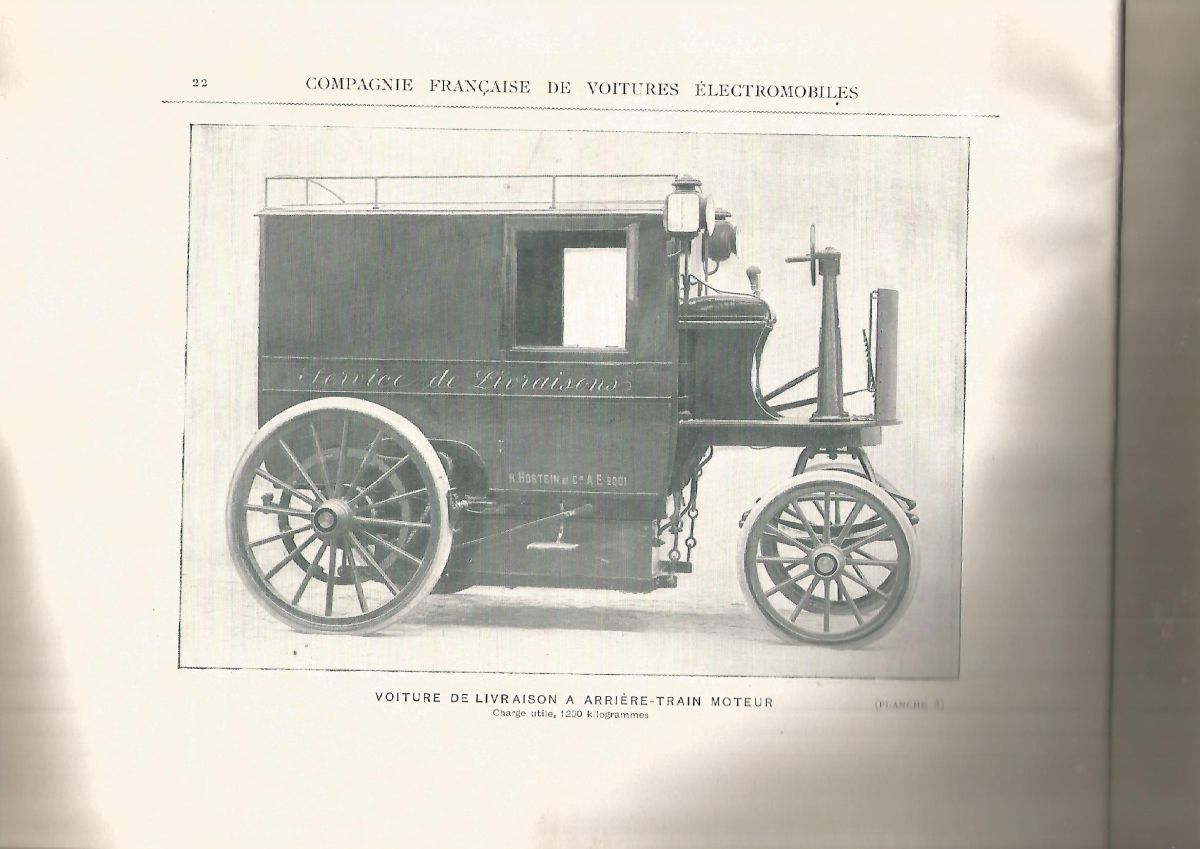 One of the oldest sales brochures for electric vehicles dates back to 1899 – yes, the electric vehicles already existed back then. The French company Compagnie Française de Voitures Electromobiles – one of many new car companies in those years – offered a taxi, vis-à-vis, landaulet, coupé and a delivery van. Depending on the model, these had rear-wheel or front-wheel drive. Called “avant-train” or “arrière-train”, which referred to the entire engine unit plus drivetrain. Avant-train for luxury vehicles, as it was lighter and therefore more elegant, arrière-train for work vehicles. And in the introduction, there is such amusing reading material as ‘the compressed air propulsion is still being tested, with the handicap of high pressure, which is dangerous in case of accidents.’ The company existed from 1898 to 1906.