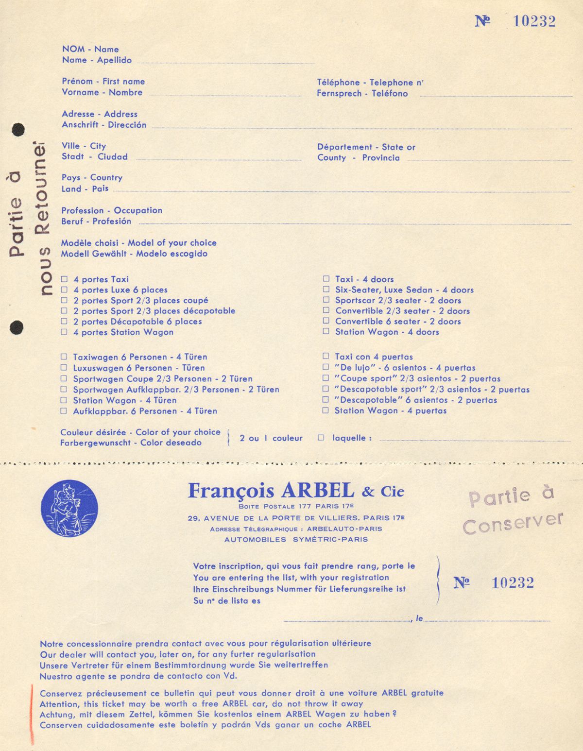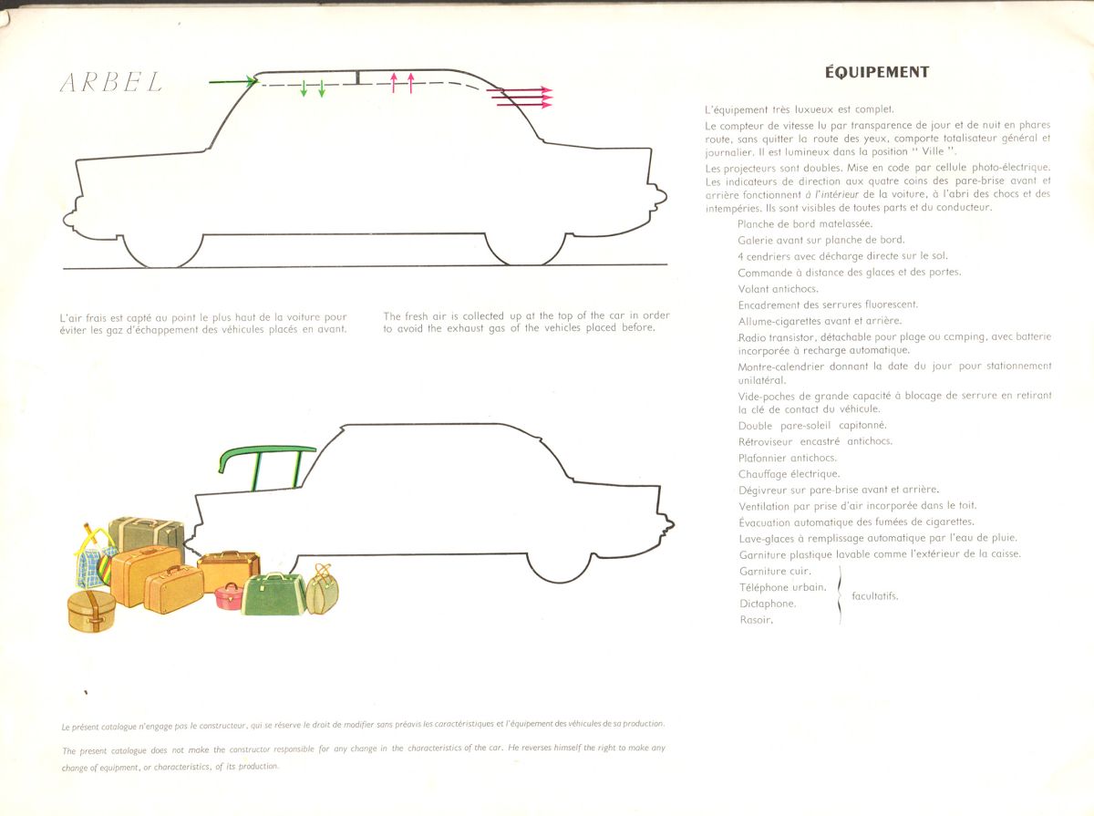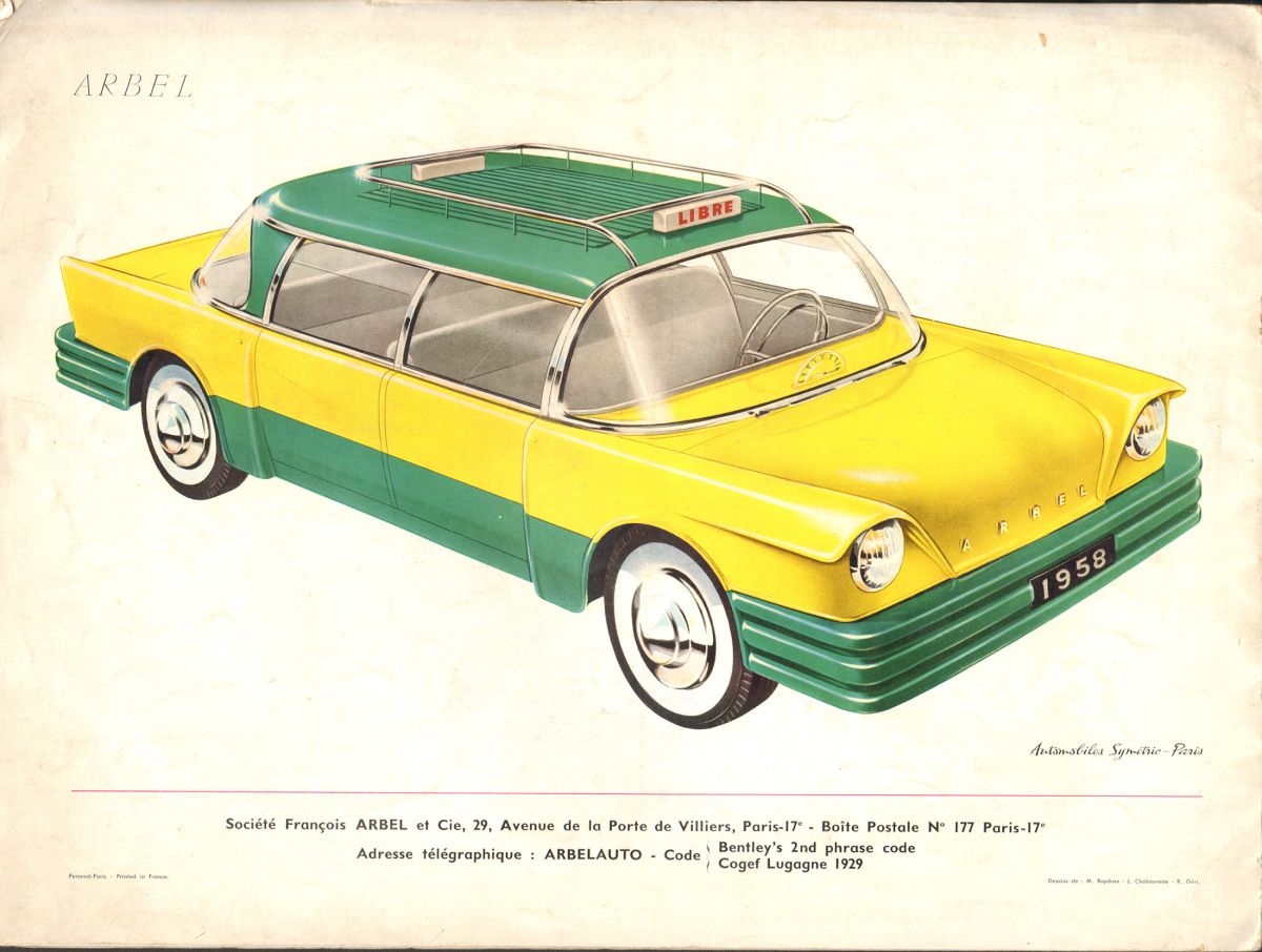 Jóvenes francesas distribuyeron en 1958 en el Pré-Catélan de Paris, en pleno Bois de Boulogne, y en el Salón de Ginebra a partir del 12 de marzo, un suntuoso catálogo – abierto medía unos 70 centímetros – de un nuevo singular automóvil, el Arbel Symetric, una continuidad de un coche simétrico presentado siete años antes.